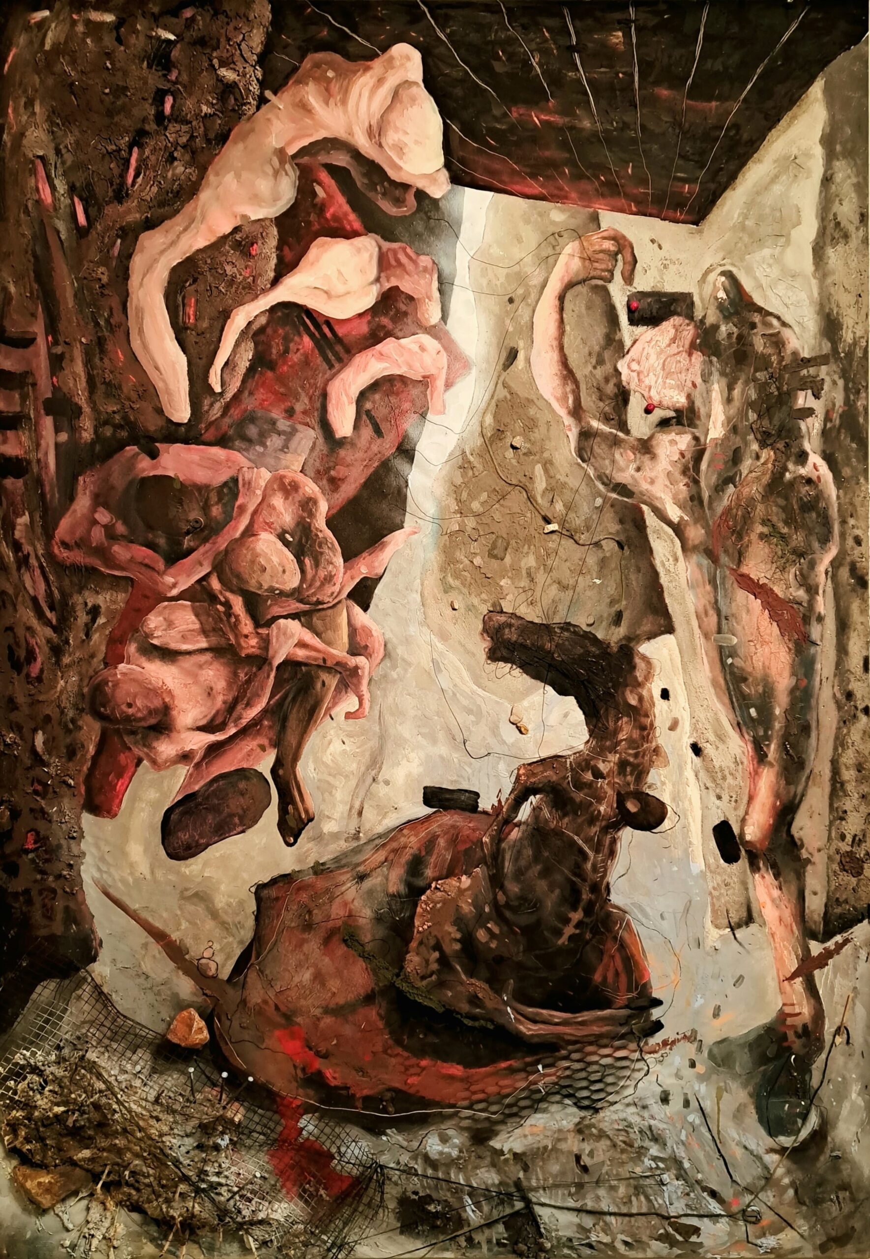 في لوحات فيليب فرحات، يلتحم الداخل مع الخارج؛ إذ يستعين بأدواتٍ وعناصر طبيعيّة بهدف الغوص في أعماق الذات. في لوحة THE RETURN TO THE CAVERNS OF LIFE (ميكسد ميديا – 135×200 سم)، يستعير الفنّان صورة الكهف ليتخيّله المُشاهد رحمَ امرأةٍ يحمل أشلاء إنسانٍ ويخطو منه حصانٌ يبذل قصارى جهده للانطلاق. وإذا ما تعمّقنا في رمزيّة اللوحة، ندرك أنّ الفنّان يعلن عبثيّة “الإنسانيّة” التي تتجسّد بأشلاء متراكمة تُصارع كي تدلّ بإصبعها على زاويةٍ من الحائط، وكأنّ الإصبع يصرخ بوجه الإنسان: “هذا هو مصيرك!”.