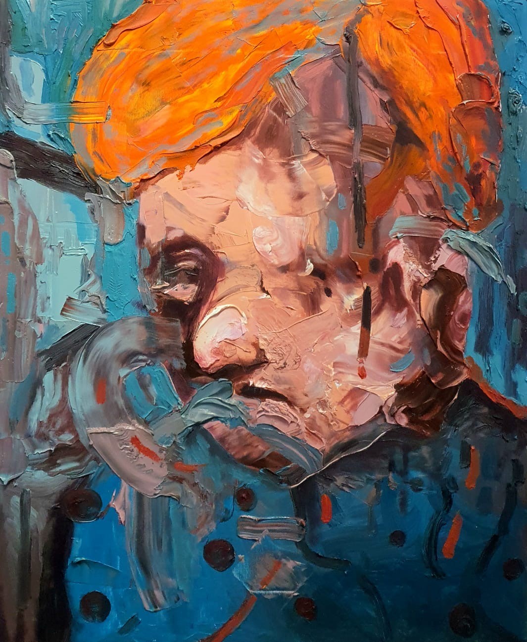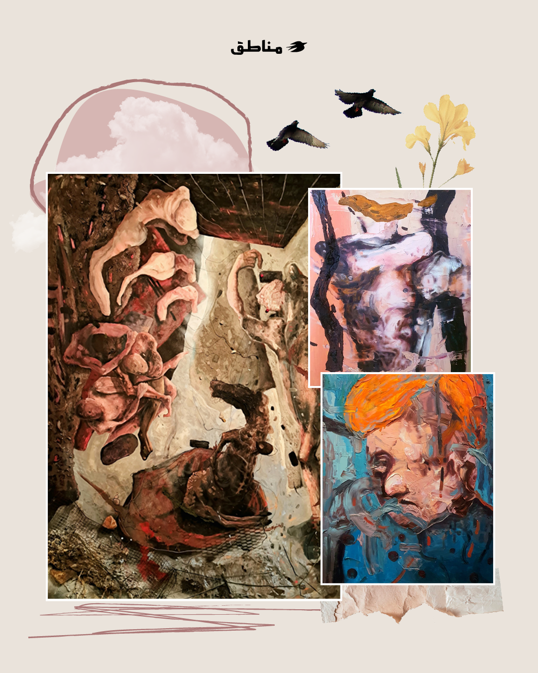 تحت عنوان SELF-DETACHMENT (ميكسد ميديا – 117×194 سم)، يظهر في مقدّمة اللوحة رجلٌ جالسٌ على كرسيٍّ بعجلات، تبدو أطرافه متجمّدة. تظهر يده كتلةً واحدة باللون الأزرق الفاتح، فيما تكسو القدمَ ألوانٌ تميل إلى الإصفرار مع زخارفَ زهريّة أشبه بمفرشٍ جميلٍ اختير لتزيين طاولة. جمودٌ يجسّده رجلٌ مُقعَدٌ يلقي بثقله ليدوس على عجلة الكرسيّ الحائر بين حصانٍ قويّ وامرأةٍ متمدّدة باستسلام. وعند التمعّن في باقي الجسد، نرى وجهًا يواجه أشياء غريبة تشكّل تشويشًا لذاته المُفكّرة. إنّها لوحة الانفصال عن الذات، تترجم تحوّل الإنسان إلى كائنٍ غريبٍ برأس حيوانٍ ذي أذنين طويلتين وقدميّ شبحٍ بلونٍ شفّاف.