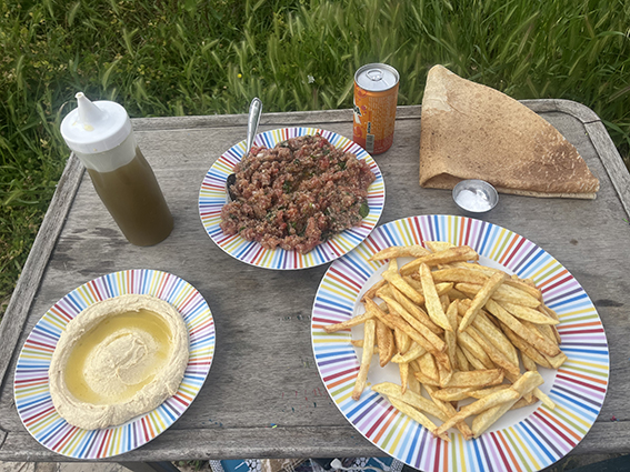 خصّصت الأسبوع الأوّل من الهدنة للنظافة، فلم أعدّ طعامًا سوى مرّة وكان “كمّونة بندورة”. أرسلت لي “لينا” زوجة عمّي كبّة بلبن. وبعد يومين أرسلت لي “فيروز” زوجة عمي الثاني كبّة بلبن و”شيشبرك”. وعزمتني “أمّ سماح” على السردين والبطاطا والطرطور. ومرّة أكلت مع سامي سودة مقليّة فيما تناول هو سلطة تونة. ومرّة أكلنا “مشاوي” عند “حسام” وسامي في قعقعيّة الصنوبر، ومرّة ثانية مشاوي عند “بسّام” ابن عمي.